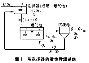 其中反應器1根據不同的試驗目的,可以分別是選擇器、曝氣池等,反應器2是曝氣池。在沒有選擇器的系統(tǒng)中,回流污泥按虛線所示的途徑回流。根據以上假設及圖1中的物料平衡關系,可給出選擇器和曝氣池中基質(碳源和DO)和微生物(菌膠團和絲狀菌)的一組方程。 選擇器