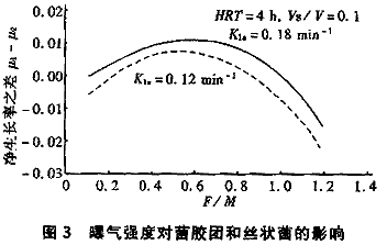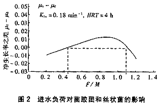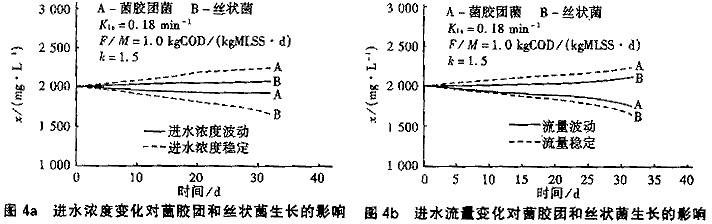在穩(wěn)定的流量和濃度條件下長期運行的結果是菌膠團細菌占優(yōu)勢,而流量或基質濃度的變化會造成絲狀菌的過度生長,且絲狀菌的生長不是一簡單的可逆過程,會造成污泥沉降性能的改變。上述結果是在相對高的負荷下的模擬結果,低負荷下的結論相反。