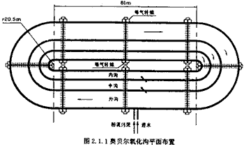 2.1 工藝設(shè)計參數(shù) ??谟鬯幚韽S是北京燕山石化公司30萬噸乙烯改擴建工程的配套環(huán)保項目,主要處理化工一廠的工業(yè)廢水、化工二廠、化工三廠的部分工業(yè)廢水及少量生活污水。該廠采用二級生物處理工藝,生物處理工段為奧貝爾氧化溝,設(shè)計規(guī)模為60000m3/d,1994年12月投產(chǎn)。生物處理工段設(shè)計為平行的兩組,每組包括1個奧貝爾氧化溝和2個二沉池。單個氧化溝的主要設(shè)計參數(shù)如下: 設(shè)計進(jìn)水流量 1250m3/h 泥齡 35d 有效池容 1733m3 MLSS 4000mg/L MLVSS 3200mg/L 容積分配 外:中:內(nèi)=56:26:18 溶解氧分布 外-中-內(nèi)=0-1-2mg/L 每個氧化溝設(shè)32組曝氣轉(zhuǎn)碟,外、中、內(nèi)溝各安裝8組曝氣器,氧化溝平面布置如圖2.1.1所示。