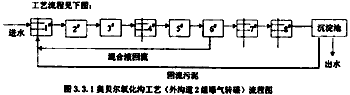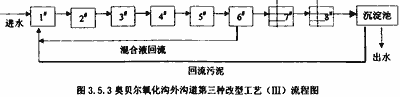 在給定條件下,采用與外溝道相同布置的單溝式氧化溝,由于平均溶解氧(0.63mg/L)提高了2倍多,碳氧化與脫氮效果均優(yōu)于奧貝爾,只是由于缺少了奧貝爾氧化溝3溝道中溶解氧0-1-2的分布,最終硝化不夠徹底。 3.5 低氧條件下的同時硝化反硝化 本節(jié)分3種形式模擬。第一種是在供氧量相同的條件下,將奧貝爾氧化溝的外溝道替換為采用微孔曝氣器的完全混合曝氣池,而中溝、內(nèi)溝不變的一種改型工藝;第二種是不改變奧貝爾的基本池型,只是在同樣供氧量的條件下,在外溝道采用微孔曝氣器代替曝氣轉(zhuǎn)碟,因此也就不存在混合液回流問題,其他均不變;第三種是在第二種的基礎(chǔ)上,在外溝道強制進(jìn)行混合液回流。目的是考察外溝道處于低氧狀態(tài)下時發(fā)生同時硝化反硝化的可能性以及奧貝爾氧化溝外溝道工藝改型的可能性。 3.5.1 工藝流程 第一種改型工藝流程見下圖: