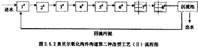 其中,1#~6#單元均為曝氣單元,供氧量均等,總供氧量及其他條件均與3.2節(jié)相同。 第三種改型工藝流程下圖: