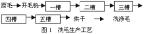洗毛是羊毛制成品的一個中間環(huán)節(jié)。由于羊毛在原產(chǎn)地收集時雜質較多,制成品時必須經(jīng)過一個洗滌過程,產(chǎn)生洗滌廢水。其生產(chǎn)工藝如圖1所示。
