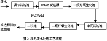 2.1 工藝的確定 洗毛廢水是洗毛生產(chǎn)工藝排出的高濃度有機廢水,其中含有泥沙、羊毛脂、羊糞,還含有少量洗滌劑和羊毛纖維。經(jīng)化驗分析證明:廢水中羊毛脂多已乳化,以O/W(水包油)形式存在,是組成廢水中BOD5,CODcr的主要成分。其色淡黃、味臭、粘稠、pH值為8.5~9.5,m(BOD5)/m(CODcr)為0.6左右。 根據(jù)以上廢水特點,采用厭氧、好氧加混凝沉淀的處理工藝。由于廢水中高濃度的CODcr,BOD5主要是由羊毛脂引起(該廠廢水中羊毛脂含量少,回收價值不大),羊毛脂的化學成分為脂肪酸和高級一元醇化合而成的脂。故先采用厭氧降解高分子物質,而后再用好氧生化,利用好氧微生物的新陳代謝作用去除水中的色度。氣味、粘稠物質等??紤]該公司管理水
