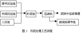 2.3 工藝流程簡述 廢水由水渠進入調(diào)節(jié)沉淀池,調(diào)節(jié)水質、水量均勻并預沉部分較大顆粒的懸浮物后進入UASB反應器。通過厭氧微生物的作用去除大部分的有機物。出水進入一級生物接觸氧化池進行好氧生化處理,然后進入中間沉淀池進行泥水分離再進入二級生物接觸氧化池進行好氧生化處理。出水加入混凝劑PAC和絮凝劑PAM進行混凝沉淀。二沉池出水達標排放或回用。 此工藝中UASB消化大量污泥。只有調(diào)節(jié)池。中間沉淀池、二沉池中產(chǎn)生污泥,且量不大疏水性好。故采用污泥通過管道進入貯泥池,然后由泵打入壓濾機房,通過壓濾機壓濾后脫水,泥餅外運填埋或作農(nóng)肥處理。貯泥池上清液和壓濾機房濾液回流至調(diào)節(jié)沉淀池進行處理。