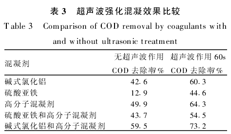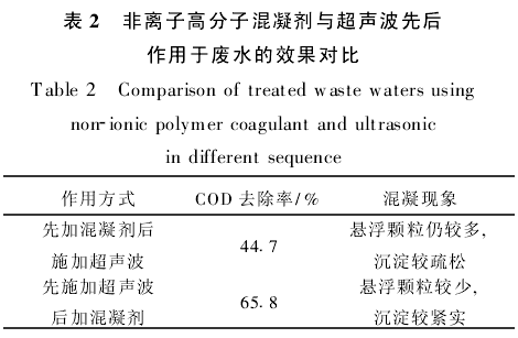在制革加工過程中,脫脂、脫毛、軟化、染色和加脂等工序所產(chǎn)生的廢水中含有大量的有機(jī)物,一般未經(jīng)處理的制革綜合廢水中COD值可高達(dá)4000mg/L~6000mg/L.目前,國內(nèi)外制革廠處理制革廢水有機(jī)物的方法主要有生物法和混凝固液分離法,將超聲波技術(shù)應(yīng)用于制革廢水處理的研究還未見報(bào)道.實(shí)際上,近年來國內(nèi)外已有一些將超聲波技術(shù)應(yīng)用于水污染控制方面的報(bào)道,如超聲強(qiáng)化處理高濃度有機(jī)廢、超聲降解水體中的環(huán)狀有機(jī)污染物、農(nóng)藥類物質(zhì)、酚類等.研究表明,超聲降解水體中的化學(xué)污染物,可單獨(dú)或與其它水處理技術(shù)聯(lián)合使用,是一種極具發(fā)展?jié)摿Φ乃幚硇录夹g(shù).本文探索超聲波技術(shù)結(jié)合混凝沉淀法處理制革廢水中有機(jī)物的強(qiáng)化途徑和處理?xiàng)l件.1 實(shí)驗(yàn)部分1.1 實(shí)驗(yàn)儀器 TC型高溫高聲強(qiáng)超聲波儀(成都市九洲機(jī)電工程研究所);攪拌器.1.2 實(shí)驗(yàn)的試劑及水樣 堿式氯化鋁(工業(yè)級),硫酸亞鐵(工業(yè)級),非離子型高分子混凝劑(本實(shí)驗(yàn)室自制).實(shí)驗(yàn)用廢水取自四川溫江科嘉制革廠的綜合廢水.1.3 實(shí)驗(yàn)方法 (1)超聲波作用條件 所用超聲波儀聲強(qiáng)為1.47W/cm2,頻率為24kHz.每個(gè)廢水樣400ml,超聲波作用于廢水的時(shí)間分別為10s、30s、60s、600s、1200s、1800s、3600s、5400s、7200s,測定超聲波作用后廢水的和混凝劑的混凝作用,控制超聲波作用最長時(shí)間為1800s. (2)混凝沉淀法處理廢水 選擇不同的混凝劑單獨(dú)使用或混合使用處理廢水,混凝劑濃度為1%,每個(gè)廢水樣為400ml,分別加入0.5ml、1ml、2ml、4ml、6ml、8ml混凝劑,相當(dāng)于樣液中混凝劑濃度分別為12.5mg/L、25mg/L、50mg/L、100mg/L、150mg/L、200mg/L,快速攪拌10min,靜置2h,取上層清液測定COD值. (3)強(qiáng)化混凝沉淀時(shí)超聲波施加方式的選擇 400ml廢水中加入1%的非