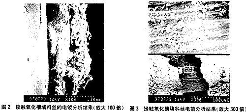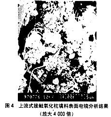 ② 從兩種膜生物反應(yīng)器對(duì)COD、色度、SS以及濁度的去除情況來(lái)看,生物單元出水隨進(jìn)水水質(zhì)變化產(chǎn)生波動(dòng),而膜單元出水水質(zhì)均較穩(wěn)定。 ③ 從SS去除情況可以看出,每隔264h左右接觸氧化槽的處理效率會(huì)出現(xiàn)一個(gè)由最低到最高再回到最低的變化過(guò)程,同時(shí)由生物單元對(duì)COD的去除率變化也可看出這一趨勢(shì)。生物單元出水COD升高主要是由出水SS升高引起的,在COD去除率處于低值時(shí)出水SS達(dá)到最高值。由于膜單元的截留作用使膜生物反應(yīng)器對(duì)COD的總?cè)コ驶痉€(wěn)定在80%以上。COD去除率的周期變化與固定生物膜的生長(zhǎng)周期密切相關(guān),當(dāng)COD處理效率處于上升階段時(shí)填料絲上生物膜的氧及營(yíng)養(yǎng)物的傳質(zhì)情況良好,此時(shí)生物膜生長(zhǎng)速度超過(guò)了脫落速度,生物膜處于高活性狀態(tài),因而對(duì)廢水中的污染物有較高的去除率,表現(xiàn)出COD去除率上升。隨著細(xì)菌大量生長(zhǎng)、膜厚增加,此時(shí)內(nèi)層膜處于內(nèi)源呼吸階段,經(jīng)過(guò)一定時(shí)間后內(nèi)層的營(yíng)養(yǎng)物耗盡,生物膜的完整性遭到破壞,同時(shí)產(chǎn)生的厭氧氣體在內(nèi)層把膜頂起,使生物膜發(fā)生大塊脫落并露出新鮮的填料表面,完成了一個(gè)生物膜生長(zhǎng)周期。脫落的生物膜隨水流從生物反應(yīng)器排出,又被機(jī)械膜截留返回生物池。 接觸氧化槽運(yùn)行696h的填料絲電鏡分析結(jié)果分別見(jiàn)圖2、3。
