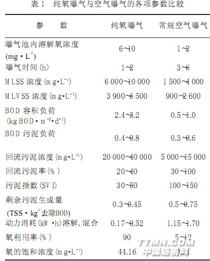 純氧曝氣與空氣曝氣的各項參數(shù)比較見表1。