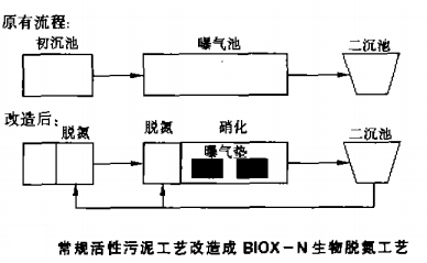 3、應(yīng)用于污水生物脫氮的三級處理廠,即采用BIOX-N工藝。由于純氧曝氣可顯著提高污泥濃度和曝氣池容積負荷,不僅可縮小曝氣池容積,而且由于污泥負荷的降低,有利于硝化反應(yīng)的發(fā)生。所以在污水處理廠的脫氮改造時,可將原有曝氣池的一部分隔開,用作反硝化的缺氧池,剩余部分則為純氧曝氣的硝化池(見圖)。這樣,無需新建任何構(gòu)筑物就可以實現(xiàn)污水處理的脫氮升級。