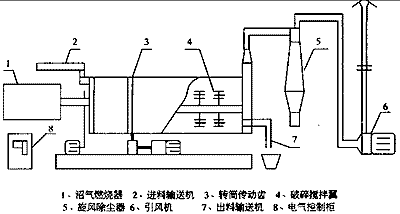 該烘干機(jī)采用直接干化技術(shù),將沼氣燃燒室產(chǎn)生的熱氣與污泥直接進(jìn)行接觸混合,使污泥中的水分得以蒸發(fā)并最終得到干污泥產(chǎn)品。 該機(jī)的主體部分為:沼氣燃燒室和與水平線略呈傾斜的旋轉(zhuǎn)圓筒,烘干方式采用順流式烘干。物料經(jīng)供料裝置從回轉(zhuǎn)式轉(zhuǎn)筒的上端送入,在轉(zhuǎn)筒內(nèi)抄板的翻動