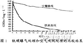 2.1.2 鐵碳曝氣處理試驗(yàn) 直接將印染—堿減量混合污水置于由等體積鐵屑、焦碳組成的鐵碳反應(yīng)池中進(jìn)行曝氣處理試驗(yàn)。圖1是相同試驗(yàn)條件下該混合污水經(jīng)鐵碳曝氣處理和僅經(jīng)空氣吹脫處理的比較結(jié)果。圖1結(jié)果表明:在長(zhǎng)達(dá)72h的處理過程中,鐵碳曝氣處理可使混合污水CODCr去除率達(dá)到90.5%,其中前14hCODCr去除速率較快,而直接空氣曝氣吹脫處理實(shí)際去除率很低。 另外,經(jīng)過鐵碳預(yù)曝氣處理,污水中TA的去除與總CODCr的去除結(jié)果基本一致。這表明采用鐵碳曝氣作為預(yù)處理手段,也可有效降低后續(xù)生化的處理負(fù)荷。
