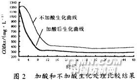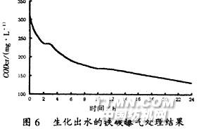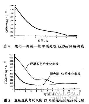 圖4是混合污水經(jīng)酸化—化學(xué)混凝預(yù)處理后污水的生化降解曲線。結(jié)果表明:經(jīng)化學(xué)混凝處理的出水繼續(xù)進(jìn)行生化處理,可以做到達(dá)標(biāo)排放。