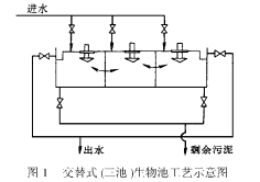 UNITANK工藝又稱一體化活性污泥法(交替生物池),是1987年,比利時SEGHERS公司提出一種新穎的活性污泥法。它由三個矩形池組成,三個池水力相連通,每個池中均設(shè)有供氧設(shè)備,可采用鼓風(fēng)曝氣或采用表面曝氣,在外邊兩側(cè)設(shè)矩形池,設(shè)有固定出水堰及剩余污泥排放口,該池既可作暴氣池又可做沉淀池,中間一只矩形池只做曝氣池。進(jìn)入系統(tǒng)的污水,通過近水閘控制可分時序分別進(jìn)入三只矩形池中任意一只池。如圖1。