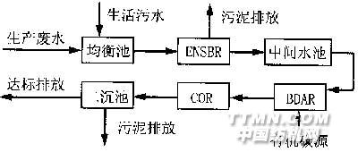 3 ENSBR/BDAR/COR處理工藝技術(shù)特點(diǎn) (1)整個系統(tǒng)污泥不回流,一方面保證了各類微生物長期在最佳環(huán)境條件下生存,因而微生物活躍、新陳代謝旺盛、降解有機(jī)物能力強(qiáng);另一方面,降低了能耗,提高了處理裝置有效利用率。 (2)處理水在ENSBR停留時間長,HRT>20 h,確保了該廢水生物硝化反應(yīng)良好進(jìn)行。 (3)各反應(yīng)器污泥濃度高,能夠富集大量的微生物,降低污泥負(fù)荷,使生物硝化和反硝化反應(yīng)得以順