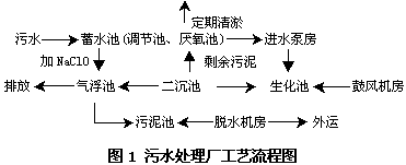 吳縣市甪直鎮(zhèn)是一座具有2000年悠久歷史的古鎮(zhèn),素有“神州水鄉(xiāng)第一鎮(zhèn)”之稱(chēng)的優(yōu)美環(huán)境、發(fā)達(dá)交通,給甪直鎮(zhèn)的開(kāi)發(fā)建設(shè)提供了有利的條件。 目前,甪直鎮(zhèn)有三資企業(yè)(多為印染工業(yè)企業(yè))100多家,僅有一座工業(yè)污水處理廠,日處理其中28家工廠排放的6000 m3廢水,而其余70多家工廠的污水未經(jīng)處理直接排放,使水體嚴(yán)重污染,嚴(yán)重影響到人民的身體健康以及旅游資源,使投資環(huán)境惡化。因此,甪直鎮(zhèn)政府決定在原有污水處理廠北側(cè)興建一座污水處理廠,以解決工業(yè)企業(yè)的污水排放問(wèn)題。1 設(shè)計(jì)水質(zhì)水量1.1設(shè)計(jì)水量 根據(jù)現(xiàn)有工業(yè)企業(yè)排放水量的統(tǒng)計(jì)以及工業(yè)區(qū)今后的發(fā)展規(guī)劃,確定新建污水處理廠規(guī)模為:14000m3/d。1.2設(shè)計(jì)水質(zhì) 根據(jù)原有污水處理廠多年的運(yùn)行資料以及現(xiàn)有蓄水池水樣取樣分析,并按照環(huán)保部門(mén)的要求,確定新建污水處理廠進(jìn)出水水質(zhì)如下: 表1 進(jìn)出水水質(zhì)一覽表 COD(mg/l)BOD(mg/l)pHSS(mg/l)色度(倍)進(jìn)水水質(zhì)800~1000280~3508~10400~600500~600出水水質(zhì)100206~970502 處理工藝流程