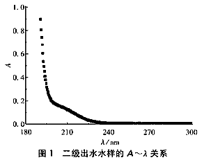 1.1 測定方法 采用UV-2501PC紫外分光光度計測定水樣的紫外吸光度數(shù)值(A)。 采用重鉻酸鉀方法測定水樣的COD值[3]。1.2 紫外吸收波長的確定 圖1是將二級出水水樣稀釋25倍的A~λ關(guān)系。