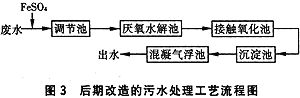 改造的主要構(gòu)筑物及設(shè)備: ① 調(diào)節(jié)池。設(shè)計(jì)原水調(diào)節(jié)池有效停留時(shí)間為8 h,整個(gè)調(diào)節(jié)池尺寸為20m×10m×2.5m ,內(nèi)分6格。在原水進(jìn)調(diào)節(jié)池前有一小渠道,在渠道中投硫酸亞鐵,使pH為7~9左右。廢水在調(diào)節(jié)池內(nèi)有一初沉?xí)r間,對(duì)池底污泥,紡織廠每年趁春節(jié)放假之際清掏外運(yùn)。 ② 厭氧水解池。呈長(zhǎng)方形,尺寸為10m×7.5m×5m,有效停留時(shí)間10h。分為兩組 ,每組都有一個(gè)脈沖布水器,其對(duì)水解池內(nèi)的配水是間歇式的,對(duì)厭氧池則起攪拌、沖刷作用。厭氧池內(nèi)的污水分污泥層、附著層、清水區(qū)。攪拌是為了防止死水、短流,沖刷能防止附著層阻塞,厭氧池內(nèi)設(shè)有斜板附著層,厭氧水解池是穿孔集水槽配水。 ③ 接觸氧化池。在原生物濾池的位置上建造,外型尺寸:20m×15m×4.5m,采用三廊道 ,內(nèi)懸掛半軟性填料(厚3m),填料接觸時(shí)間20h,底部裝有微孔曝氣頭,氣水比為15∶1, 經(jīng)測(cè)試池內(nèi)溶解氧濃度為3.8mg/L。 ④ 沉淀池。為豎流式、方形,尺寸為6 m×5 m×5 m,從池頂中心進(jìn)水,出水經(jīng)鋸齒形集 水槽。豎流式沉淀池主要是沉淀接觸氧化池脫落的生物膜,出水進(jìn)入混凝氣浮池。 沉淀污泥全部回流至厭氧水解池,補(bǔ)充營(yíng)養(yǎng),原設(shè)計(jì)進(jìn)入貯泥池的排泥管保留。 ⑤ 混凝氣浮池。進(jìn)一步去除在沉淀池中不能下沉去除的細(xì)小顆粒,投加凈水劑,凈水劑是