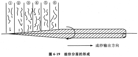 摩擦紡紗過程中,纖維以垂直于成紗輸出方向并沿塵籠楔形凝聚區(qū)逐漸添加并捻人錐形紗尾上,使摩擦紗形成從紗芯到外層逐層包覆的分層結(jié)構(gòu)。圖6—19所示為6根條子并排喂入時(shí),成紗在組份成份上形成分層結(jié)構(gòu)的情況。