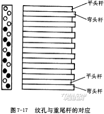 紋板的結(jié)構(gòu)如圖7-17所示,每塊紋板上有兩列紋釘孔,呈錯開排列,第一、二列紋孔分別對準彎頭重尾桿和平頭重尾桿。每列紋孔控制一次開口,紋板的紋孔列數(shù)應為組織循環(huán)緯紗數(shù)的整數(shù)倍,如果組織循環(huán)緯紗數(shù)為奇數(shù),則應乘上一個偶數(shù),以得到整數(shù)塊紋板。此外,因為花筒是八角形的,紋板的總數(shù)應不小于8塊(16緯)。
