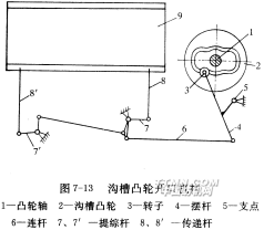 在前述的單動式和復動式單花筒多臂開口機構(gòu)中,拉刀在開始移動一段距離之后才與拉鉤接觸,于是接觸產(chǎn)生拉刀與拉鉤間的沖擊,引起動作失誤、機件磨損。為了消除這一現(xiàn)象,拉刀開始移動之前作微量的自轉(zhuǎn),在與拉鉤嚙合之后再作共同移動,這自轉(zhuǎn)是由凸輪軸兩端的溝槽凸輪來控制的。拉鉤運動結(jié)束后,溝槽凸輪通過連桿使拉刀微量倒轉(zhuǎn)以恢復原來的初始位置。