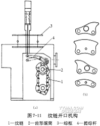 凸輪開口機構(gòu)的不足之處,其一是只能生產(chǎn)簡單組織的織物,如果織制較為復雜的織物,凸輪外形曲線將變得非常復雜,為減小壓力角,又必須將凸輪基圓直徑放大,以致開口機構(gòu)變得過分笨重;其次,一定的凸輪外形只能生產(chǎn)一定開口規(guī)律的織物品種,為了適應織物品種多變的要求,必須儲備大量的各種開口凸輪,這在實際生產(chǎn)中是不經(jīng)濟的。事實上,凸輪外形曲線一般由小半徑到大半徑、大半徑到小半徑、大半徑到大半徑和小半徑到小半徑共四種不同弧段拼接而成。如果采用模塊化設計方法,將這四種弧段對應的凸輪部分分列開來,單獨制造,而后將它們按織物組織的要求如同鏈條一樣串聯(lián)起來形成紋鏈,即可滿足各種復雜的開口要求。圖7-11(a)是現(xiàn)代無梭織帶機的紋鏈開口機構(gòu)的簡圖。紋鏈1由圖7-11(b)所示的四種不同形狀(弧段)的鏈塊按開口規(guī)律要求串接而成,套裝于齒形滾筒2上,主軸每一回轉(zhuǎn),滾筒轉(zhuǎn)過一塊鏈塊,驅(qū)動綜框3完成相應的開口動作。每頁綜框?qū)粭l長度相同的紋鏈,前后頁綜框的紋鏈塊可以互換,綜框動程通過改變提綜桿4的支點位置來調(diào)節(jié)。紋鏈開口可適應較為復雜的織物組織的織造,緯紗循環(huán)長達數(shù)十緯,最高可響應1800r/min的織機轉(zhuǎn)速。