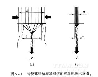 但從工藝原理角度看,傳統(tǒng)環(huán)錠紡和緊密紡工藝在紗線成形時(shí)的過(guò)程不同,區(qū)別特征主要是(圖5—1):傳統(tǒng)環(huán)錠紡牽伸工藝接著加捻工藝[圖5—1(a)],但中間存在連接兩者的加捻三角區(qū);而緊密紡的牽伸工藝[圖5—1(b)]先緊接著纖維集聚工藝再接著加捻工藝,纖維集聚工藝取代加捻三角區(qū),并使先后銜接處不再產(chǎn)生新的加捻三角區(qū)或非控制區(qū)。