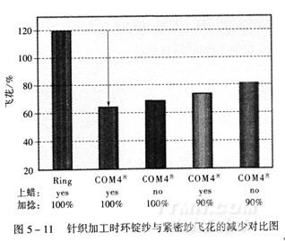 不僅對(duì)機(jī)織工序具有非常顯著的積極影響,而且對(duì)針織工序也有明顯的正面效果。緊密紗用于針織機(jī)上時(shí),由于紗線毛羽少,強(qiáng)力高,織造時(shí)斷頭率降低,停機(jī)少,織疵相應(yīng)減少,針織物質(zhì)量得到改善,產(chǎn)量大幅增加,針織機(jī)效率可顯著提高。某些針織產(chǎn)品還可免去常規(guī)的上蠟工序,縮短工藝流程,有助于降低生產(chǎn)成本。緊密紗由于毛羽、灰塵、飛花都比較少,因此,針織加工時(shí)可改善生產(chǎn)環(huán)境,相應(yīng)減輕清潔工作量(圖5—11)。