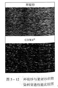 在進(jìn)行免燙整理時(shí),由于高溫高濕,普通環(huán)錠紗的織物強(qiáng)力下降 25%。緊密紗由于結(jié)構(gòu)緊密,強(qiáng)力高,可彌補(bǔ)免燙整理時(shí)織物的強(qiáng)力損失(圖5—13)。