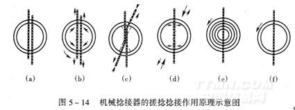 ⑥打開搓捻盤,把捻接好頭的紗線抽出來,完成全部機(jī)械捻接動(dòng)作[圖5—14(f)]。