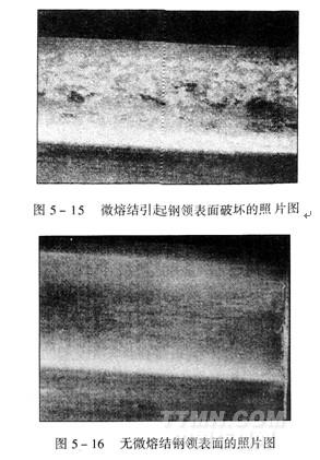在傳統(tǒng)的鋼領表面,鋼絲圈材料中的微粒會被熔結到鋼領上,由于這個微熔結過程的存在,造成鋼領運轉軌道過早的磨損和破裂(圖5—15、圖5—16),并導致鋼絲圈運作不穩(wěn)定,紗線出現張力波動,使成紗質量下降,也使鋼絲圈壽命減短。因此,設計和制造耐磨損的鋼領和鋼絲圈對緊密紡工藝而言非常重要。