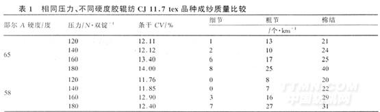 2.3 羅拉加壓不宜過大,一般控制在140 N/雙錠左右,并且加壓要穩(wěn)定,切勿重加壓,以免膠輥脫殼位移。表1為紡CJ11.7 tex紗,在相同壓力下使用不同硬度膠輥的成紗質(zhì)量對(duì)比。