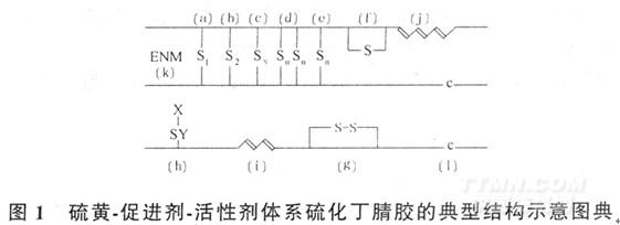 圖中:[a]單硫交聯(lián);[b)雙硫交聯(lián);[c]多硫交聯(lián)[x=3-6];[d]鄰位交聯(lián)[n=1~6];[e]引附屬于共同的或相鄰的碳原子上的交聯(lián);[f]橡膠分子內(nèi)單硫環(huán);[g]橡膠分子內(nèi)雙硫環(huán);[h]多硫—促進(jìn)劑側(cè)基;[i]共軛二烯;[j]共軛三烯;[k]附加的網(wǎng)狀復(fù)物;[1]C-C交聯(lián)。
