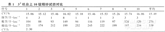 前紡半制品質(zhì)量尤其是粗紗質(zhì)量的好壞,對成紗半制品質(zhì)量具有至關(guān)重要的影響;如果粗紗條干不勻,錠間、臺間差異大,將會嚴(yán)重惡化成紗條干。我們曾對兩臺粗紗機(jī)所紡粗紗進(jìn)行同錠試紡,其試驗結(jié)果見表