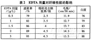 纖維素酶用量為3g/L,滲透劑JFC用量2g/L,雙氧水及燒堿用量均為10 L,考察EDTA用量的影響,結(jié)果見(jiàn)表2。