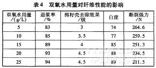 纖維素酶用量3g/L,EDTA用量2g/L,滲透劑JFC用量2g/L,燒堿用量l0 L,雙氧水用量的影響見(jiàn)表4。