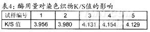 退煮漂一浴一步法前處理工藝條件:浴比l:30,溫度80℃,時間30min,硅酸鈉5g/L,平平加一00.5g/L,滲透劑B2g/L,30%雙氧水用量8ml/L,DH值為8,酶用量分別設(shè)定~2g/L、3g/L、4g/L、5g/L、6g/L,經(jīng)處理后織物的性能見表3。
