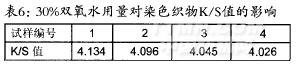 從表6中數(shù)據(jù)可以看出,隨著雙氧水用量的增加,染色后織物的K/S值逐漸減小,這說明隨著雙氧水用量的增加,提高了織物的白度,所以染色后織物的表觀色深降低。