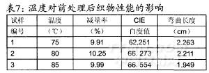 退煮漂一浴一步法前處理工藝條件:浴比l:30,時(shí)問30min,硅酸鈉5g/L,平平加一00.5g/L,滲透劑B2g/L,酶用量5g/L,30%雙氧水用量8ml/L,pH值為8,溫度分別設(shè)定為75、80、85,經(jīng)處理后的織物性能見表7。
