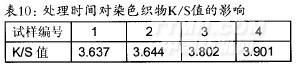 從表l0中數(shù)據(jù)可以看出,隨著處理時問的增加,染色后織物的K/S值逐漸增大,說明雙氧水處理時間增加,織物白度增強,染色后織物的表觀色深則降低。