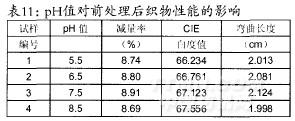 退煮漂一浴一步法前處理工藝條件:浴比1:30,時間35min,硅酸鈉5g/L,平平加一O0.5g/L,滲透劑B2g/L,酶用量5g/L,30%雙氧水用量8ml/L,溫度為80%,處理液pH值分別為5.5、6.5、7.5以及8.5,經(jīng)處理后的織物性能見表11。