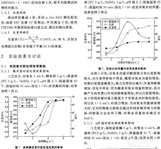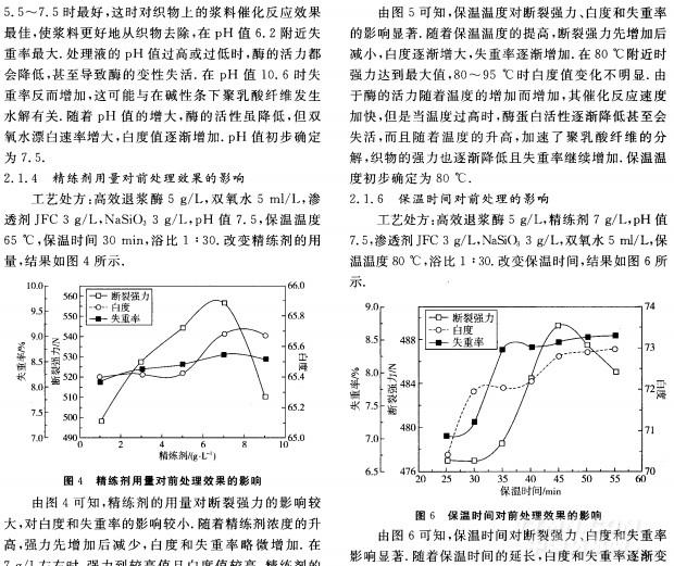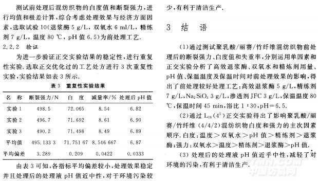 摘要:采用高效退漿酶一步法對聚乳酸/麗賽/竹(4/4/2)混紡織物進行前處理,通過白度、斷裂強力和失重率指標進行評價,分別對高效退漿酶、雙氧水和精練劑的用量、pH值、保溫溫度和保溫時間進行單因素實驗研究,得出合適范圍,通過I(4j)正交試驗,進一步確定上述因素對前處理的影響,找出高效退漿酶一步法前處理最佳工藝.實驗結(jié)果表明高效退漿酶一步法前處理工藝能滿足聚乳酸/麗賽/竹混紡織物的后續(xù)生產(chǎn)要求并有利于清潔生產(chǎn).