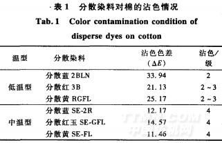 選用低溫型分散染料三原色分散藍(lán)2BLN、分散紅3B、分散黃RGFL和中溫型分散染料三原色分散藍(lán)SE一2R、分散紅玉SE—GFL、分散黃SE-FL為研究對(duì)象,考察2類分散染料對(duì)棉組分的沾色性能,結(jié)果如表1所示。