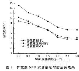 從圖中可看出,擴散劑NNO對棉纖維具有很好的防沾色效果,隨著擴散劑NNO質(zhì)量濃度的增加,3種分散染料的沾色色差△E都明顯降低。擴散劑NNO屬于陰離子型表面活性劑,分散染料為非離子型染料,不含有水溶性基團,疏水性強,難溶于水,但易通過增溶作用增溶于擴散劑NNO膠束中。棉纖維在溶液中表面帶負電荷,擴散劑NNO形成的膠束外層也帶有負電荷,二者斥力很強,所以其膠柬很難吸附到棉纖維上,這樣擴散劑NNO對棉纖維應(yīng)該具有很好的防沾色效果。當擴散劑NNO質(zhì)量濃度達到2.5g/L時,再增加用量,防沾色效果增加不明顯,從節(jié)約成本的角度考慮,染色工藝中擴散劑NNO質(zhì)量濃度選用2.5g/L。