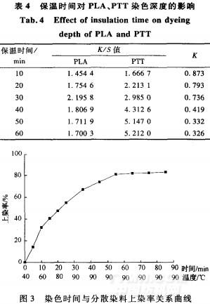 從表4可看出,染后PLA的染色深度始終沒有PTT高,PTT染色深度隨著保溫時(shí)間的延長(zhǎng)越來越深,PLA的染色深度在30min時(shí)達(dá)到最大,30min后有下降的趨勢(shì)。隨著保溫時(shí)間的增加,同色平衡指數(shù)K越來越低,30min后值急劇下降。原因是染色到保溫時(shí)間30min左右(染色時(shí)間55min左右),上染基本達(dá)到平衡,此后上染率增加不大(見圖3)。這時(shí)若再延長(zhǎng)保溫時(shí)間,染液中已無過多的染料再上染纖維,由于PTT對(duì)分散染料的親和力比PLA更強(qiáng),PLA上已經(jīng)上染的分散染料會(huì)向PTT組分轉(zhuǎn)移,最終導(dǎo)致保溫30min后,K值急劇下降。