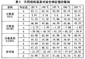 選擇焙烘時間60s,選取不同的焙烘溫度對分散黃Es—G、分散藍ES—GB、分散黃棕S-2RFL及拼染草綠色分散染料進行試驗,焙烘后在75%硫酸中爛棉取滌綸,并進行不同焙烘溫度下染色布樣特征值的測試,結(jié)果見表1。