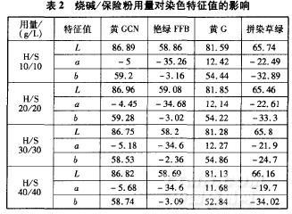 還原染料只有在含燒堿和保險粉的還原液中,才能被還原成對纖維具有親和力的溶解性隱色酸鈉鹽,所以還原染料的上染率對燒堿、保險粉用量的依賴性很大。燒堿和保險粉用量必須適當,過多或過少都會影響還原染料的上染,造成色差。試驗采用不同燒堿/保險粉(H/S)用量對單色還原染料染色及拼染草綠色,結(jié)果見表2。