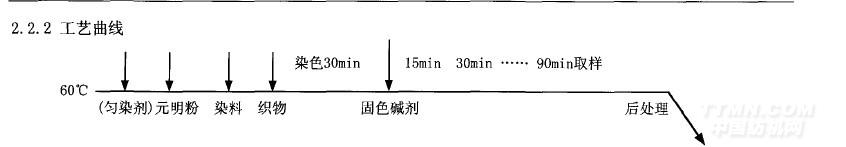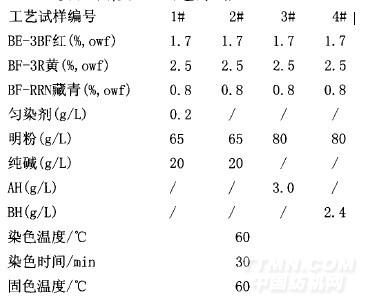 根據(jù)廠方推薦的鹽堿處方及工藝選用敏感色咖啡色進(jìn)行實(shí)驗(yàn),然后從得色深度、勻染性及染色牢