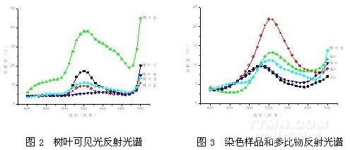 圖3是染色滌綸樣品與參比物的反射光譜曲線。可以看出,7#樣品和10#參比物的反射光譜曲線比較接近,7#比8#樣品反射值要低,可能是加入了黑色染 料,使得色光偏深暗一些;同理9#比10#顏色淺,在520~700納米處反射值大一些。不難看出7#樣品模擬樹葉5比較接近。
