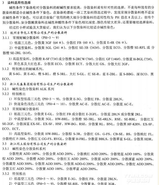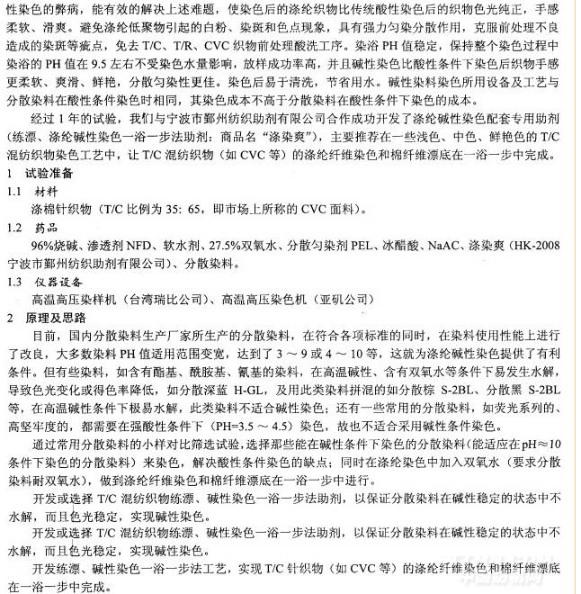 傳統(tǒng)的T/C混紡織物染整工藝是:漂底(對(duì)于黑色、藏青色、棗紅色等顏色深而發(fā)暗的織物,可以直接毛坯染色,不需要漂底).分散染料染滌綸(酸性條件下).還原清洗一套染棉。這種工藝時(shí)間長(zhǎng),水、電、人工等成本高。