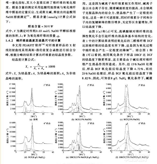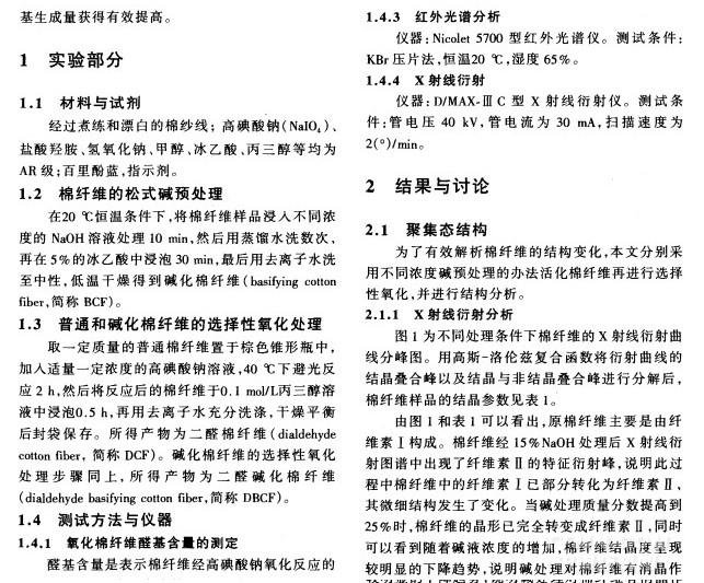 長期以來,濃堿大多被用于對纖維素的絲光化處理 。本文探索采用堿處理對棉纖維進行預活化加工,再采用高碘酸鈉對棉纖維進行選擇性氧化處理。利用堿對棉纖維的膨化作用,提高棉纖維的可及性和反應性 ,從而在選擇性氧化后棉纖維的醛基生成量獲得有效提高