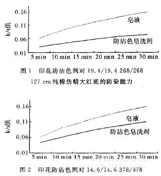 印花織物經(jīng)蒸化后的色牢度及鮮艷度,很大程度取決于水洗皂洗的效果,而選擇性能優(yōu)良的皂洗劑,對防止白底沾污,提高鮮艷度尤為重要。我公司過去選用的皂洗劑,是由非離子表面活性劑,苯磺酸鹽與其他助劑復(fù)配而成,做一般活性印花的皂洗液尚可,但對于白底深色印花且要求白底較白的產(chǎn)品,如:雙邊深色仿臘花布,其白邊及留白處沾色嚴(yán)重,影響產(chǎn)品質(zhì)量。為此我們又對皂洗劑配方進(jìn)行了多次改進(jìn),增加了具有分散、吸附、螯合、助洗、增白等作用的多功能螯合分散劑、三聚磷酸鹽、CMC等成分,提高了其防沾色能力,使其既具有一定的凈洗能力,又具有良好的防染能力,對提高產(chǎn)品的鮮艷度,防止白底污染,具有良好的作用。實(shí)驗(yàn)表明:加入印花防沾染劑的防沾污能力遠(yuǎn)遠(yuǎn)大于一般皂洗液的防沾污能力。結(jié)果見圖1、圖2,圖中K/S值表示沾污程度,K/S值越小則表示織物受沾污越輕。